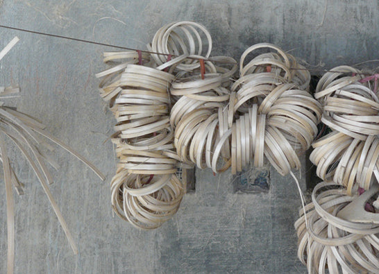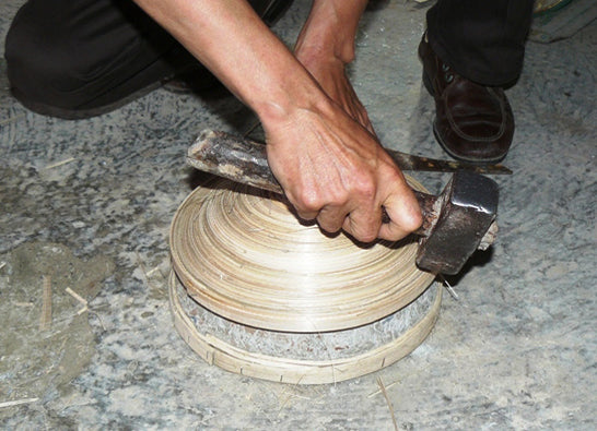 Für unsere Schüsseln biegen die Handwerker aus den gepressten Streifen Ringe, die zu Scheiben zusammengesetzt werden. Diese werden dann über einer Schablone aus Stein in die Endform geklopft und fixiert. Dann wird die Schale in diversen Durchläufen mit Reismehl verspachtelt, mit Akryl Lack grundiert und sorgfältig geschliffen. Abschließend wird der Schlusslack (matt oder glänzend) aufgetragen.